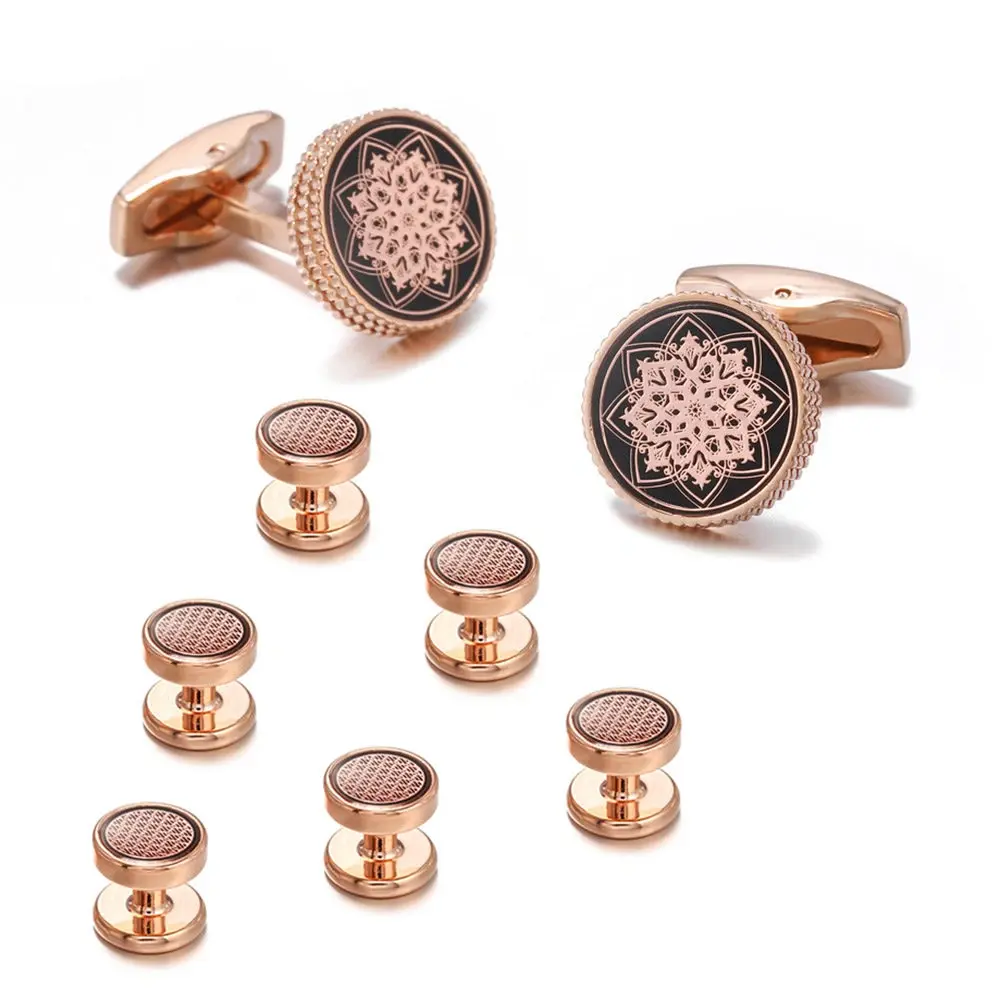 Complete your formal attire with this elegantly coordinated Rose Gold and Black Enamel Set. This comprehensive ensemble includes a pair of cufflinks and six matching shirt studs, designed for a perfectly unified look from cuff to collar. Each piece features a warm, lustrous rose gold finish, with a deep black enamel center adorned by an intricate, symmetrical rose gold filigree or woven pattern. The cufflinks are equipped with a classic and secure T-bar closure, while the studs provide a seamless finish for your dress shirt. Rendered in a sophisticated palette of rose gold, black, and silver, this collection embodies modern luxury and attention to detail. Ideal for adding a distinguished and harmonious touch to a tuxedo or suit for weddings, black-tie events, or as an exceptional gift. Discover the complete, refined ensemble at Cufflinks Palace.