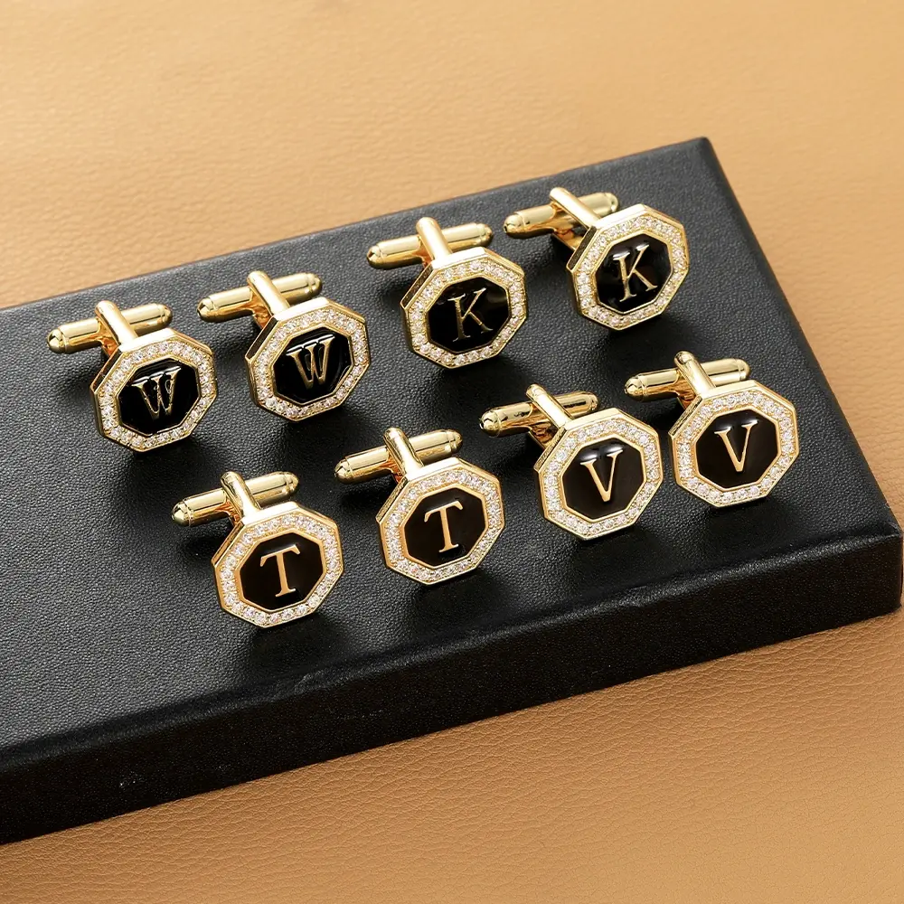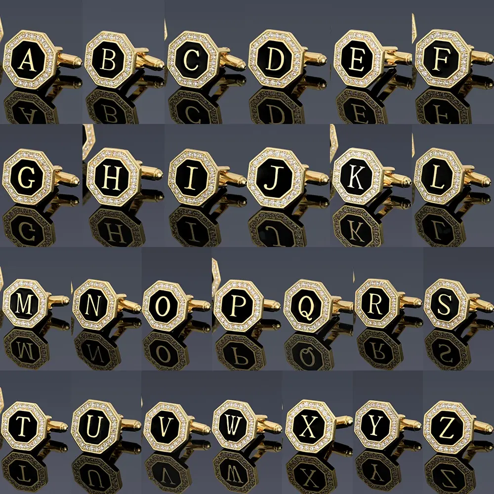Presenting the ultimate collection for personalized style: our Complete Alphabet Cufflinks Set. This meticulously curated set includes every letter from A to Z, each crafted as a distinct and luxurious accessory. Every cufflink features a sleek octagonal shape with a deep black face, prominently showcasing a single, elegant gold letter at its center. The design is elevated by a surrounding frame of brilliant crystal accents, set within polished gold-toned metal, creating a striking contrast of sophistication and shine. Secure and classic backing ensures reliable wear.