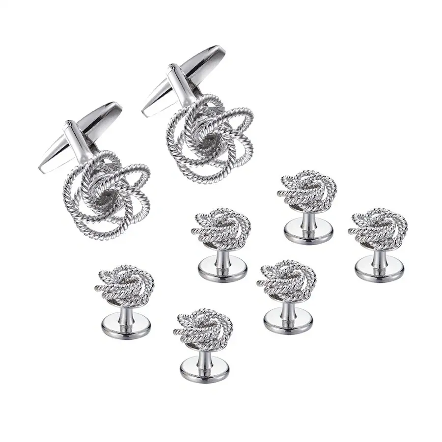 Achieve perfectly coordinated sophistication with this complete formal set. Featuring a unified design language, the collection includes two cufflinks and six matching shirt studs, all showcasing an intricate, three-dimensional knot motif rendered in a cool, polished silver finish. The detailed rope-like texture adds depth and a refined tactile quality to each piece, catching the light with a brilliant shine. The cufflinks are equipped with a secure T-bar closure, while the studs provide a seamless finish for your dress shirt front. This 8-piece ensemble is the definitive solution for adding a modern, elegant, and harmonious detail to a tuxedo or suit, ideal for weddings, black-tie events, or as a distinguished gift. Experience flawless coordination from cuff to collar.